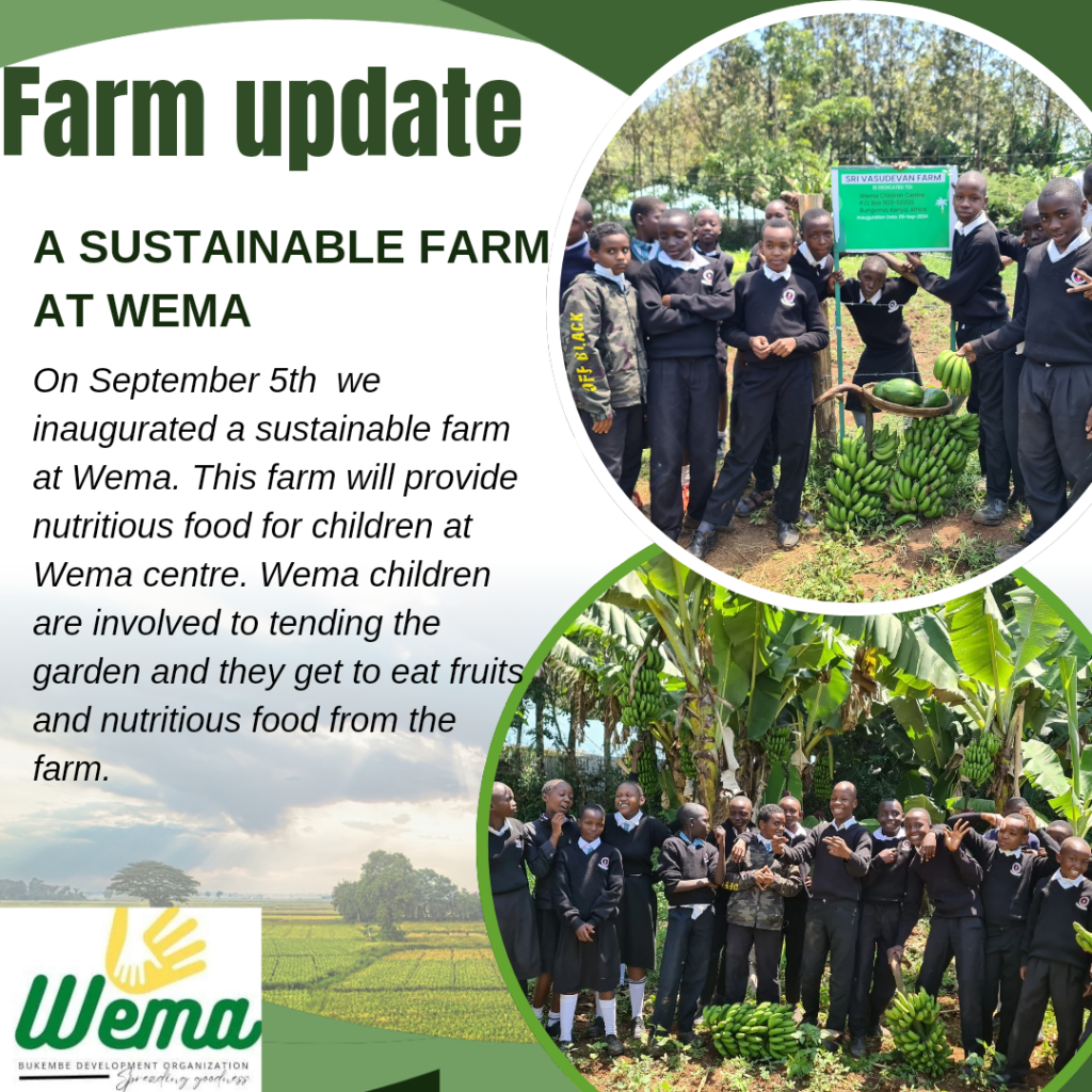 On September 5th, we inaugurated a sustainable farm at Wema. This farm will provide nutritious food for children at Wema Centre. Wema children are involved to tending the gardens and they get to eat fruits and nutritious food from the farm.